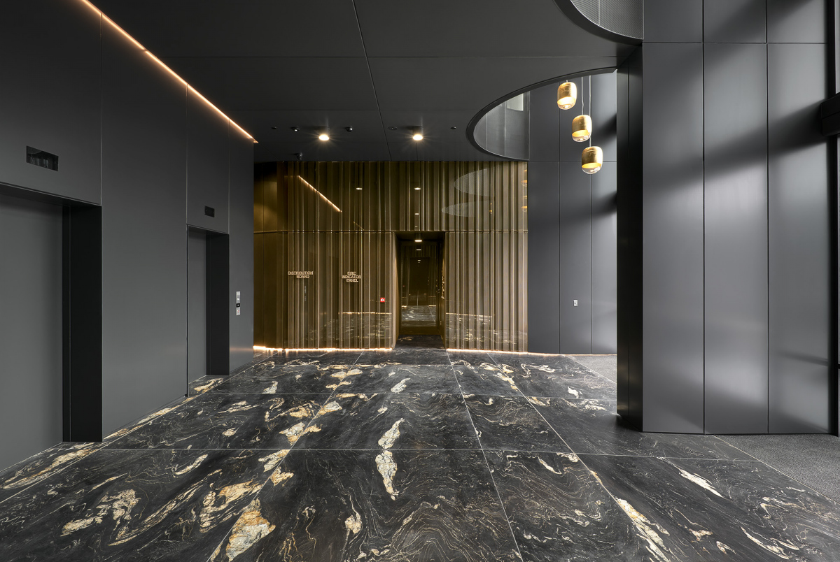 Le hall d'accueil des bureaux de Gwynne Street reflète un design moderne et luxueux. Avec l'utilisation de palettes de matériaux et de couleurs réfléchies, Idle Architecture Studio a créé un espace d'entrée sobrement élégant et grandiose.